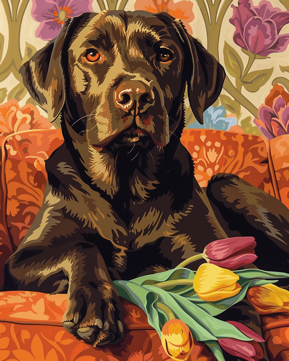 צביעה לפי מספרים - כלב מכוסה פרחים